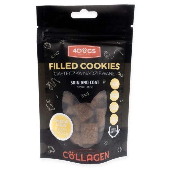 A 4DOGS szőr és bőrtápláló kutyakeksz egy egészséges, táplálék-kiegészítő finomság. Összetevői között szerepel a szarvasagancs, omega zsírsavak, cink és biotin, amelyek ápolják a házikedvenc kültakarójának egészségét. Érzékeny bőrű és allergiás kutyákra lett optimalizálva, de egészséges kutyának is adhatod, megelőzés vagy jutalomfalat céljából.