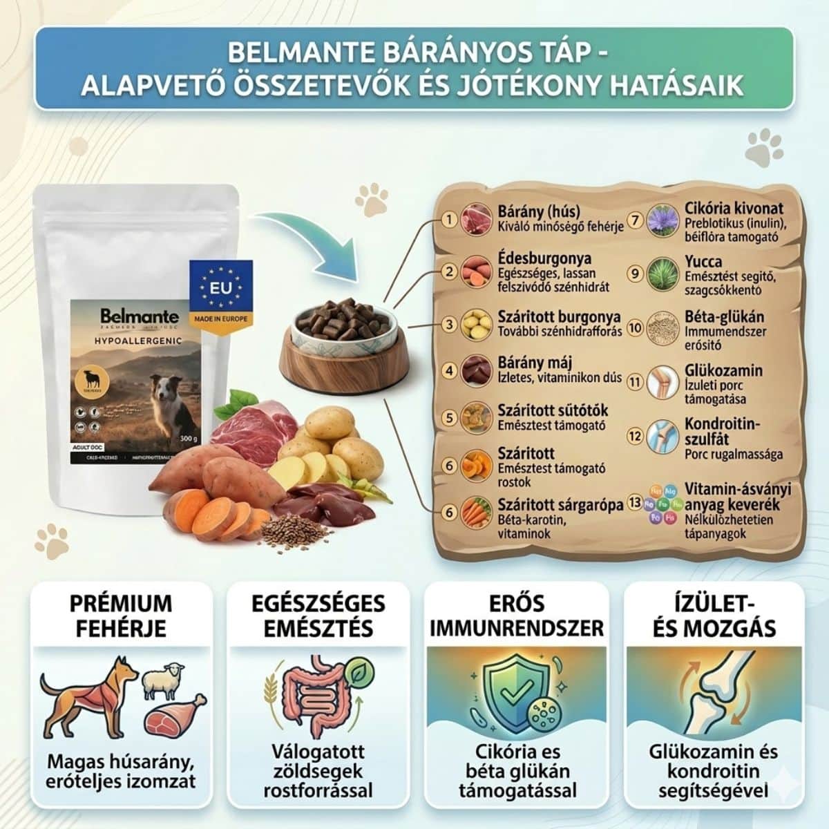 Mit tartalmaz a Belmante Hipoallergén Bárányos Hidegen Préselt Táp?