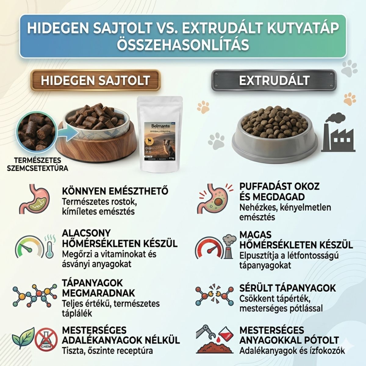 Alacsonyabb hőmérsékleten készül, így az alapanyagok természetes értékei nagyobb arányban megőrződnek. A pellet szerkezete eltérő, a gyomorban fokozatosan esik szét.