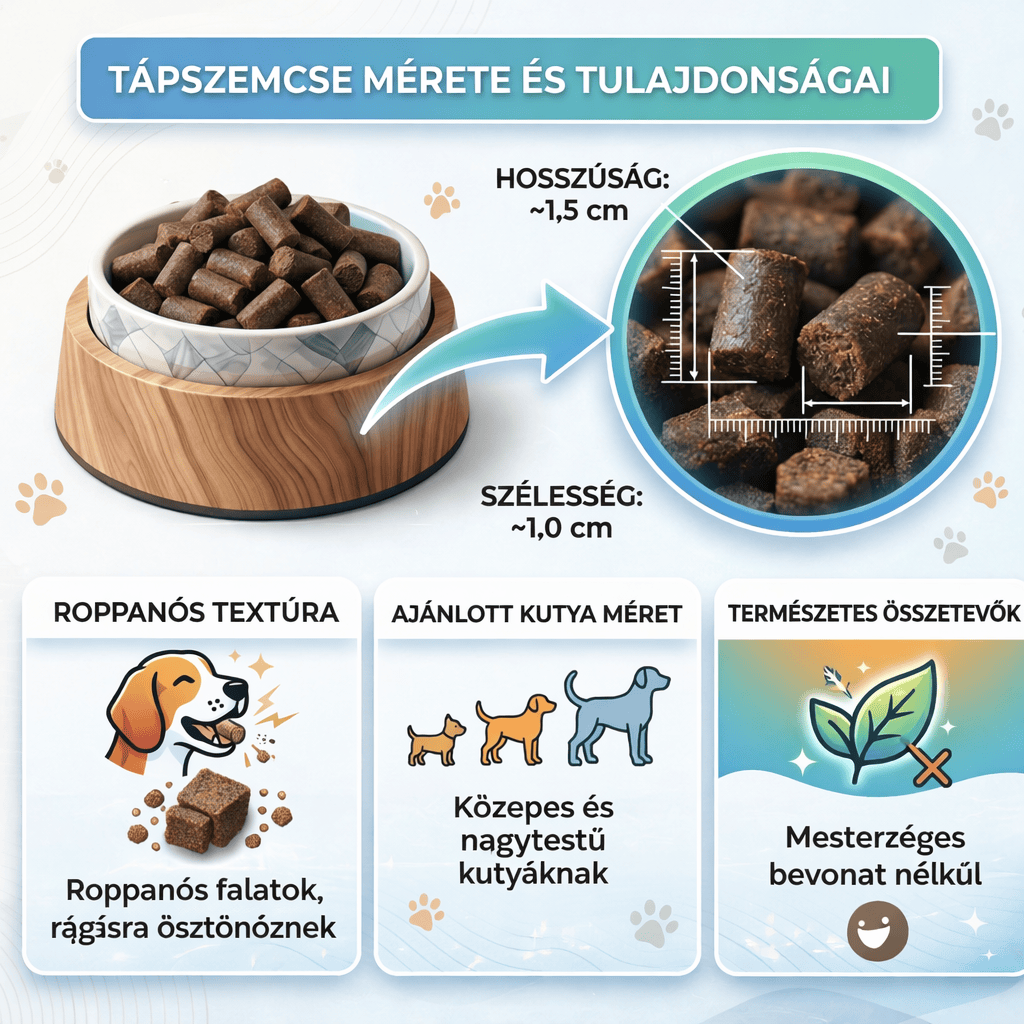 A hidegen sajtolt technológia megőrzi az összetevők természetes értékeit és kíméli az emésztést. A hozzáadott glükózamin és kondroitin támogatja az ízületeket, a vitamin- és ásványianyag-komplex pedig hozzájárul a vitalitáshoz, az egészséges bőrhöz és fényes szőrzethez.